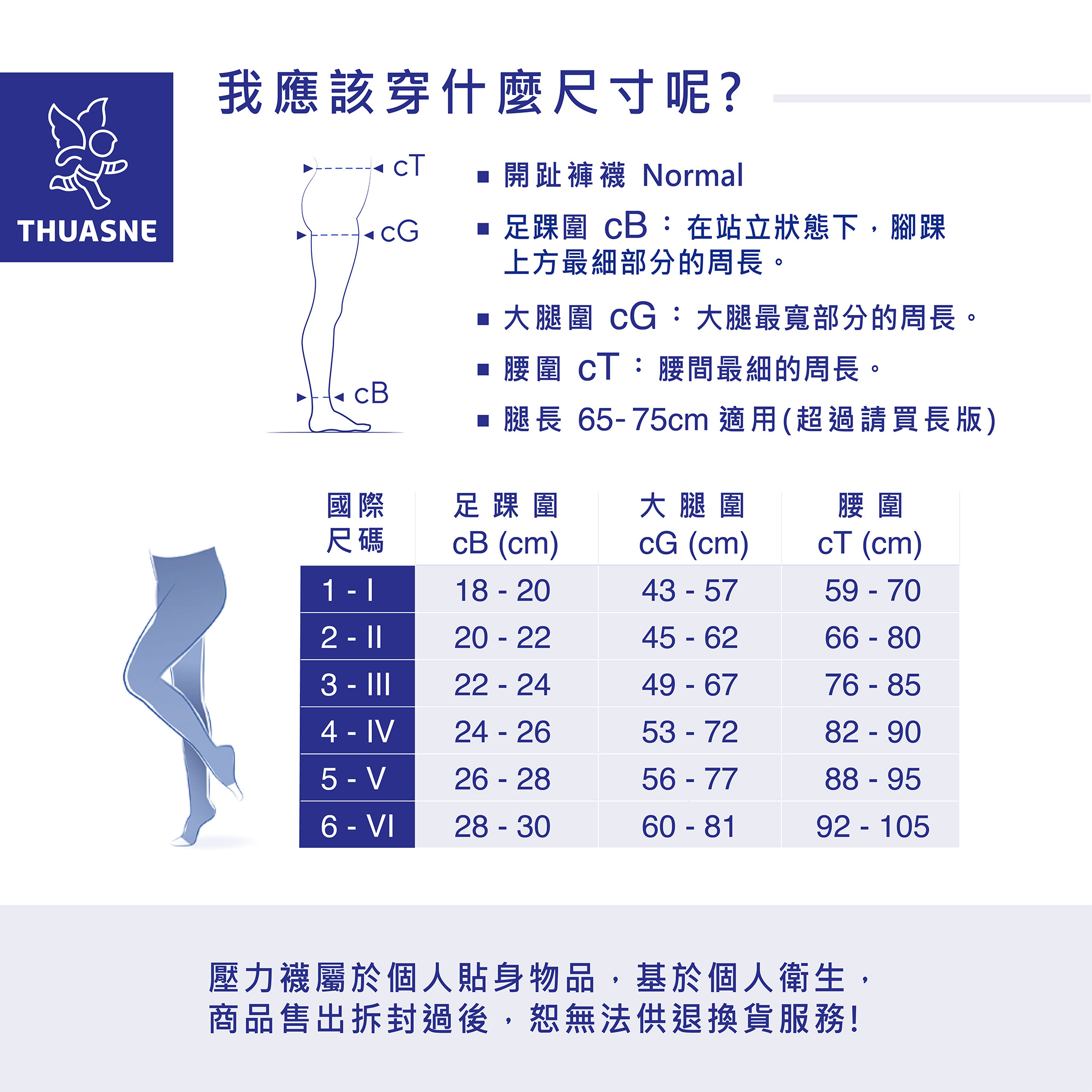 ※ 註:壓力襪屬於個人貼身物品,基於個人衛生,商品售出拆封過後,恕無法供退換貨服務!購買前請仔細確認尺寸再下單,謝謝您的配合!